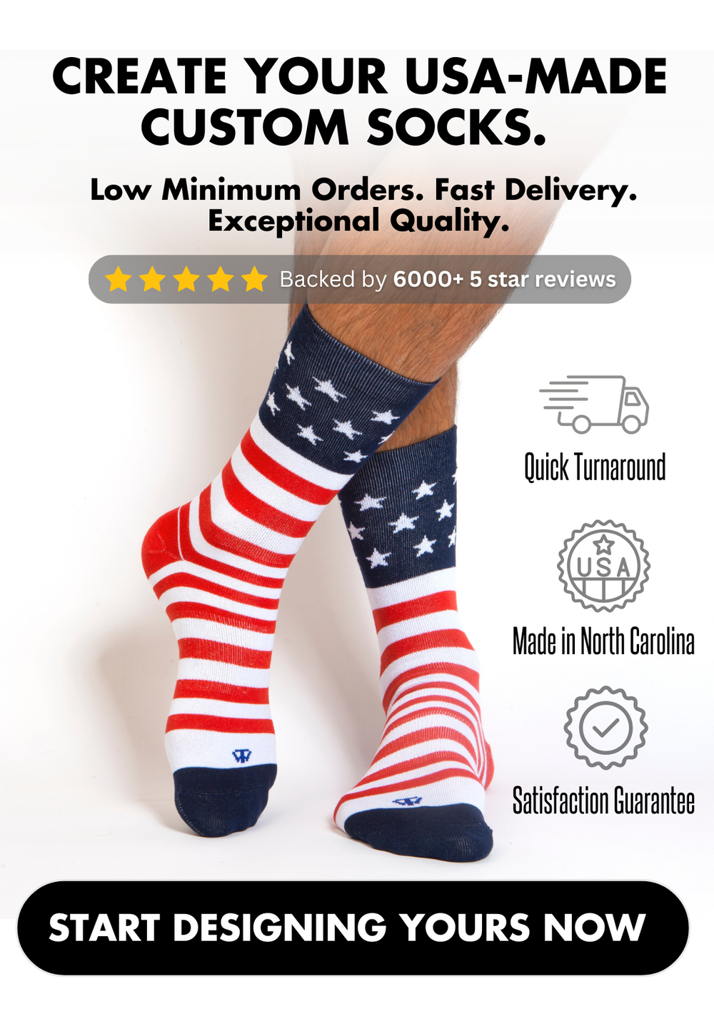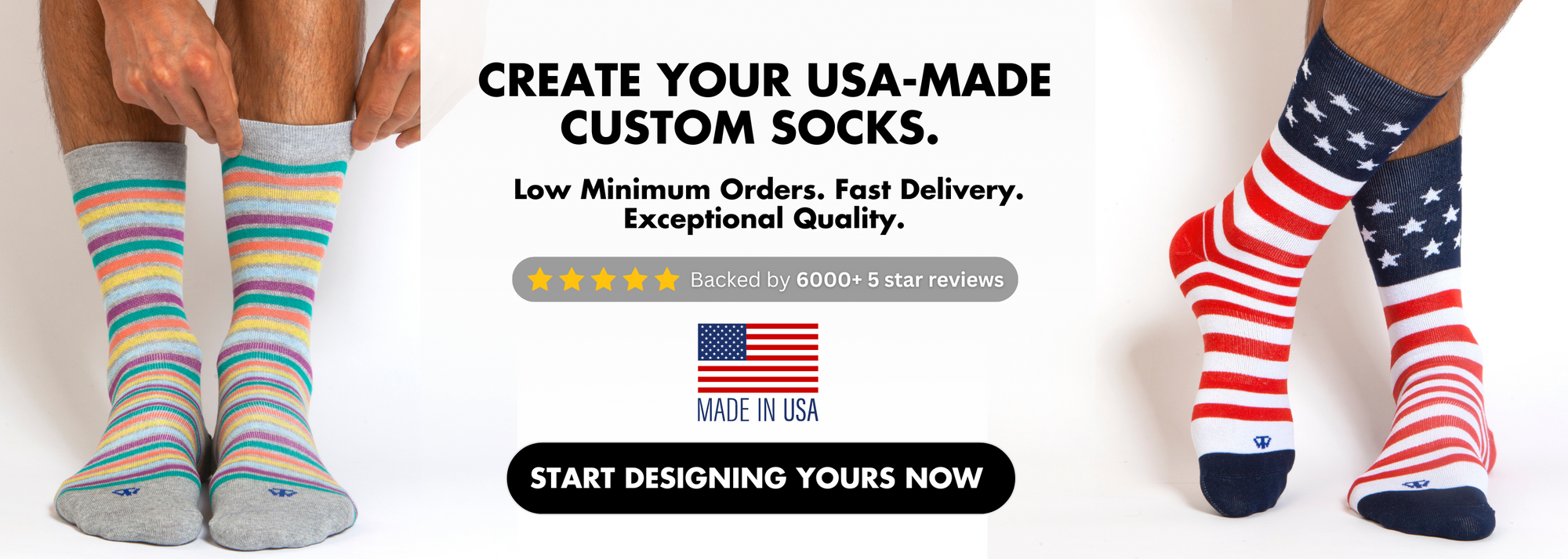 Looking for high-quality custom socks? The Sock Factory offers expert craftsmanship and personalized design services, perfect for businesses, events, and retail. Proudly made in the USA, our custom socks combine style and durability, with options to customize colors, patterns, and logos. Enjoy a seamless ordering process with low minimums, fast lead times, and top-notch customer service. Whether you need branded socks for promotions or unique designs for resale, The Sock Factory delivers premium custom socks that stand out. Elevate your brand with custom socks from The Sock Factory.
